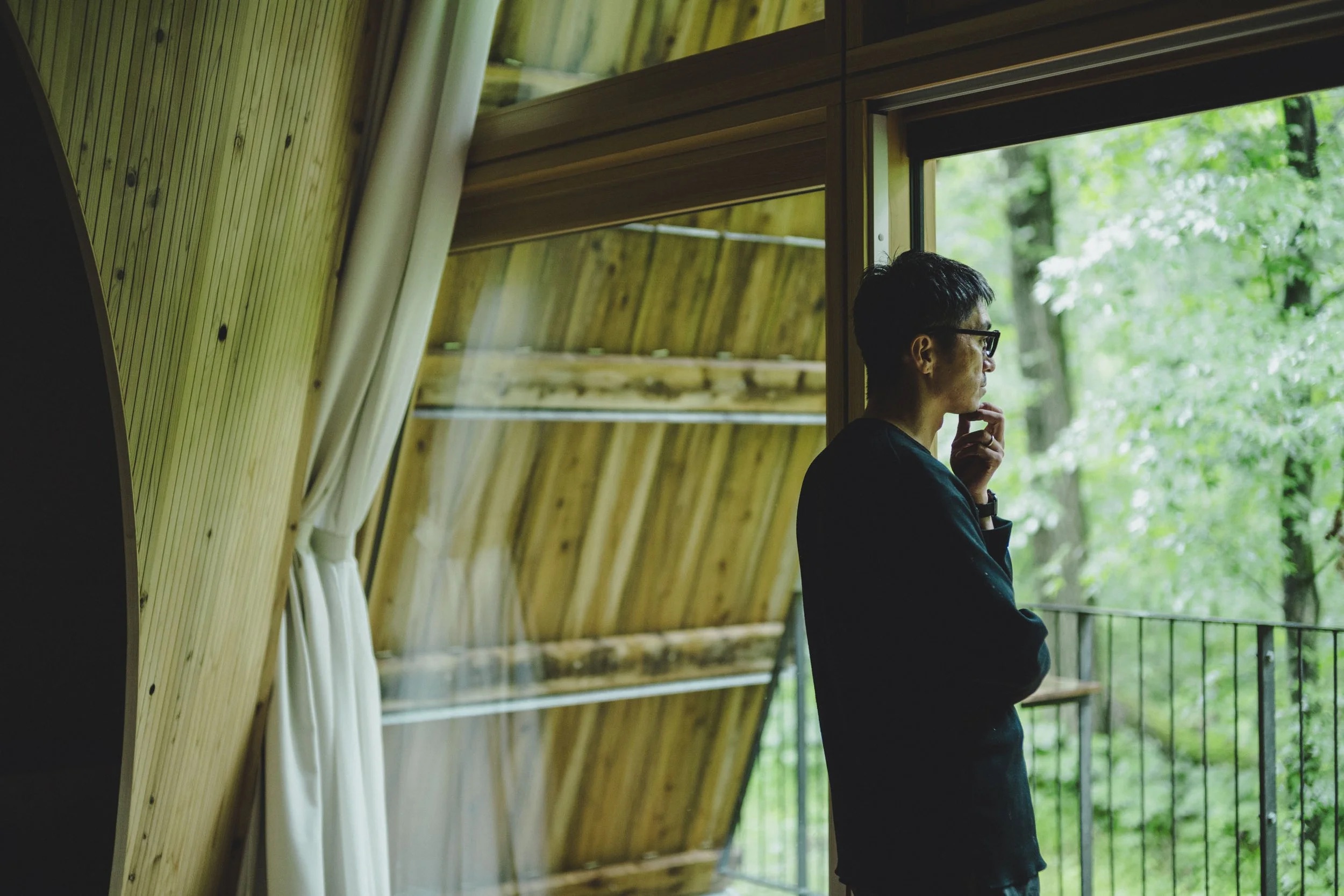 でもここには、聞いてほしいいろんな森の音がある。その音をしっかり聞けるように、大きい窓をつくって、音を少しでも集められるこの有機的な形を取り入れています。耳の構造と一緒で、まっすぐな壁よりも有機的な形の方が、音が入りやすく聞きやすい」。