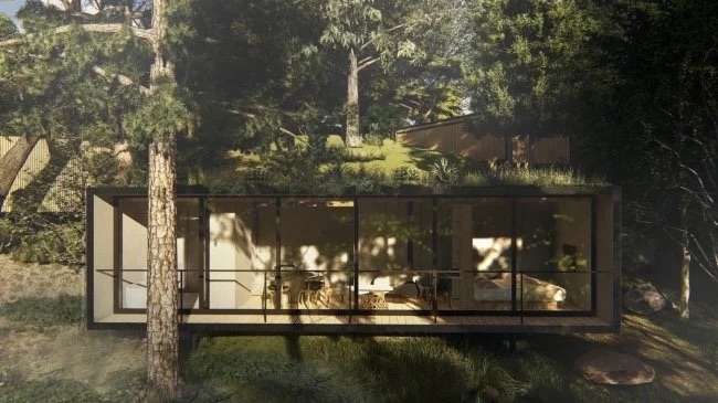〈BEE〉の内側にも目を向けてみよう。エントランスを入ると、両側から包み込むような壁が迫り、キッチン、バスルーム、その奥には書斎、ベッドルーム、そして自然を望む大きな窓へとつづく。