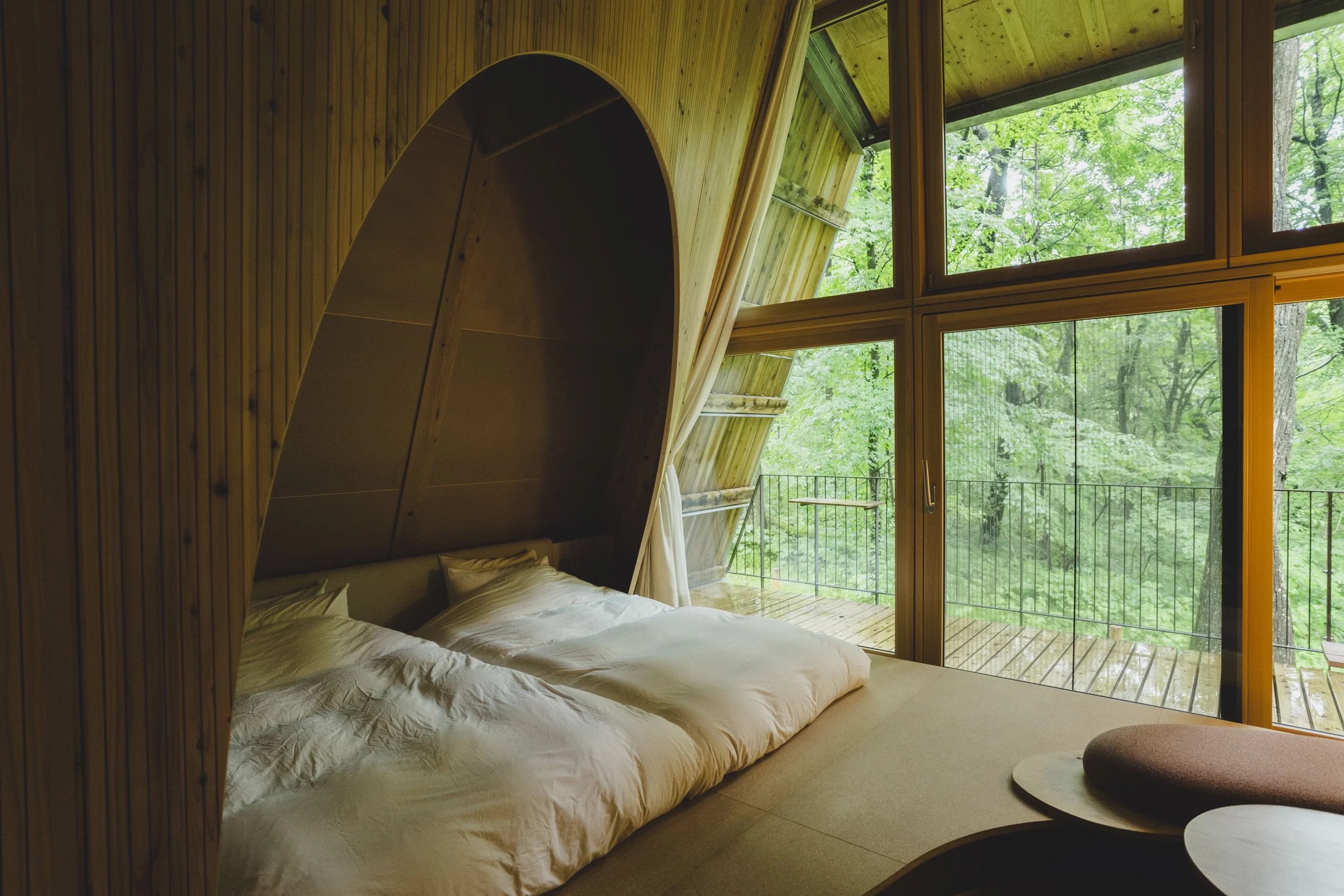 滞在を体験として捉え、自然とのつながりに触れる。曲線の壁と4つの空間は、キャビンでの時間をつうじて、人が本来持っていた機能を復活させ正常に戻すことを目的にたどり着いた設計だったのだ。