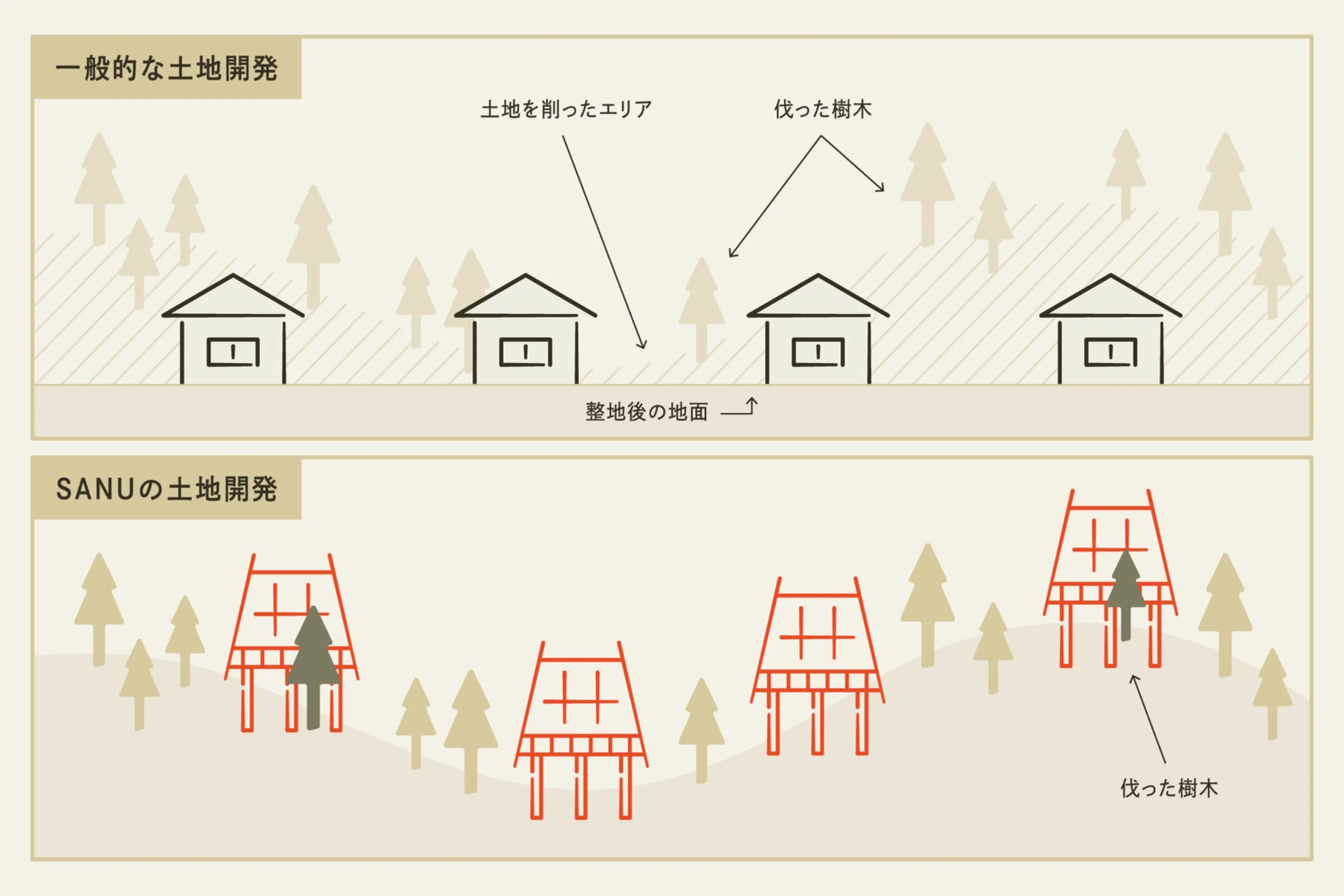 「それはおかしいじゃん。自然を守りたいのに杭を打つために山を崩すなんて、すごく悪いことしてるじゃん。結局、自社で杭を打つ機械を先行投資して開発しました。ちょっとぶっ飛んでますよね。まだSANUとの契約が1件もなかったのに。でも、これまでと同じじゃダメだし、デザインだけではなく、つくり方や維持メンテナンス、環境も考えないといけない時代になってきた。それを実現するためには、やっぱり挑戦しないと。