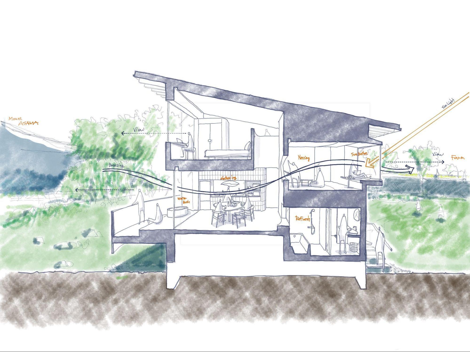 「家族や仲間と過ごす空間は、ひとつづきであってほしいと思っています。ただ、それは必ずしも同じ平面である必要はなくて、ハイキングのように登っていくこと、降りて行くことで、景色や関係性が少しずつ変わっていき、気づきや会話が自然と生まれていく。そんな体験を建築としてつくれないかと考えたのが出発点でした。」